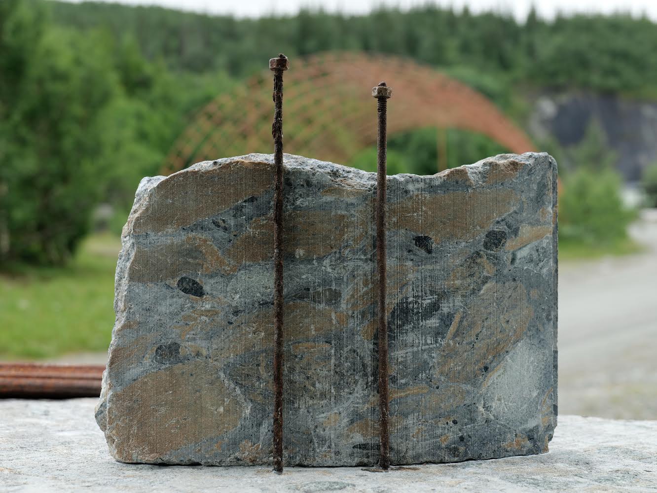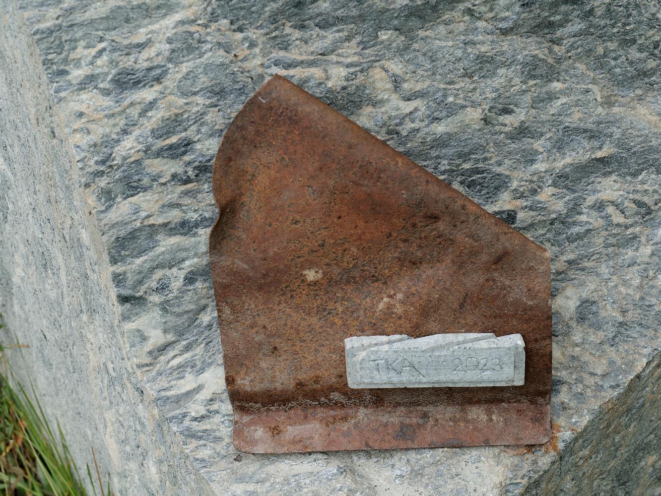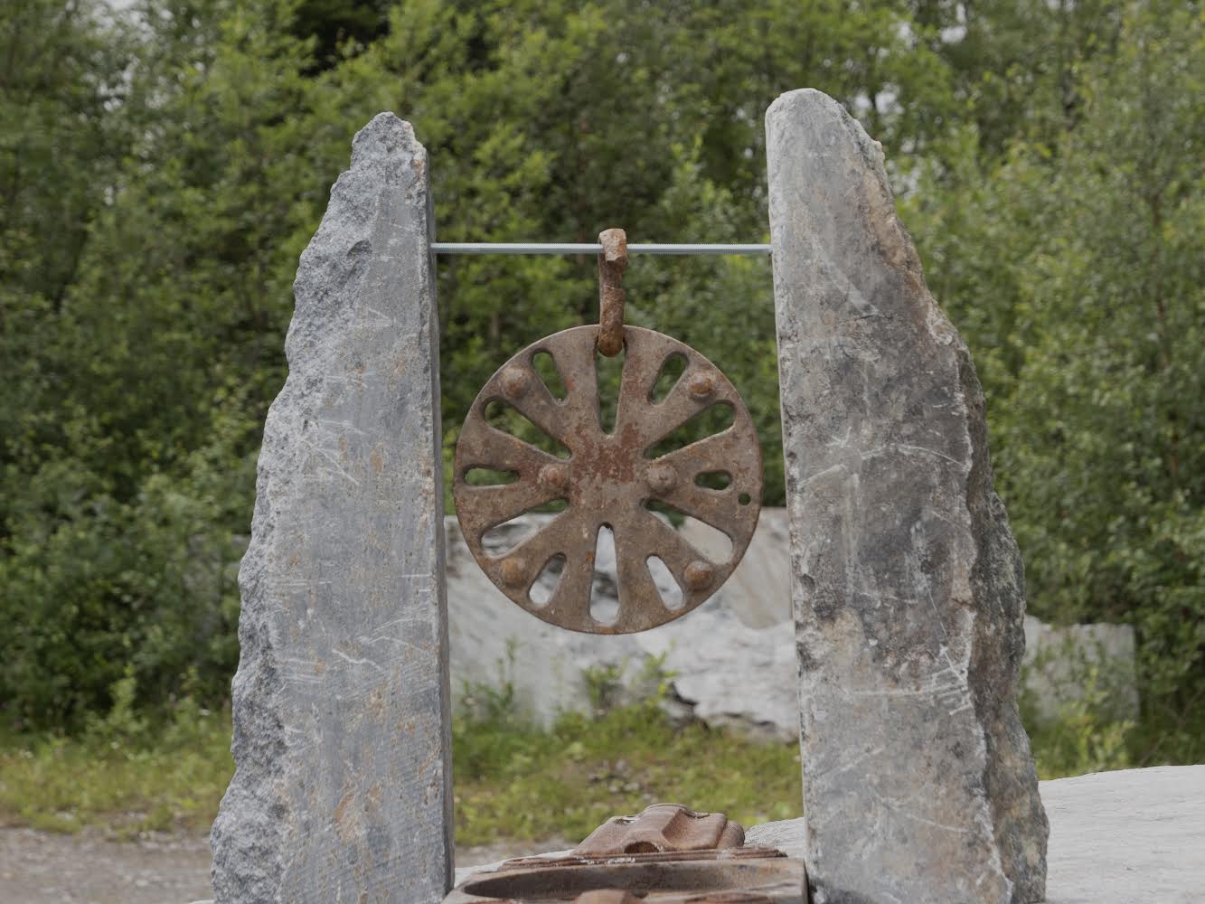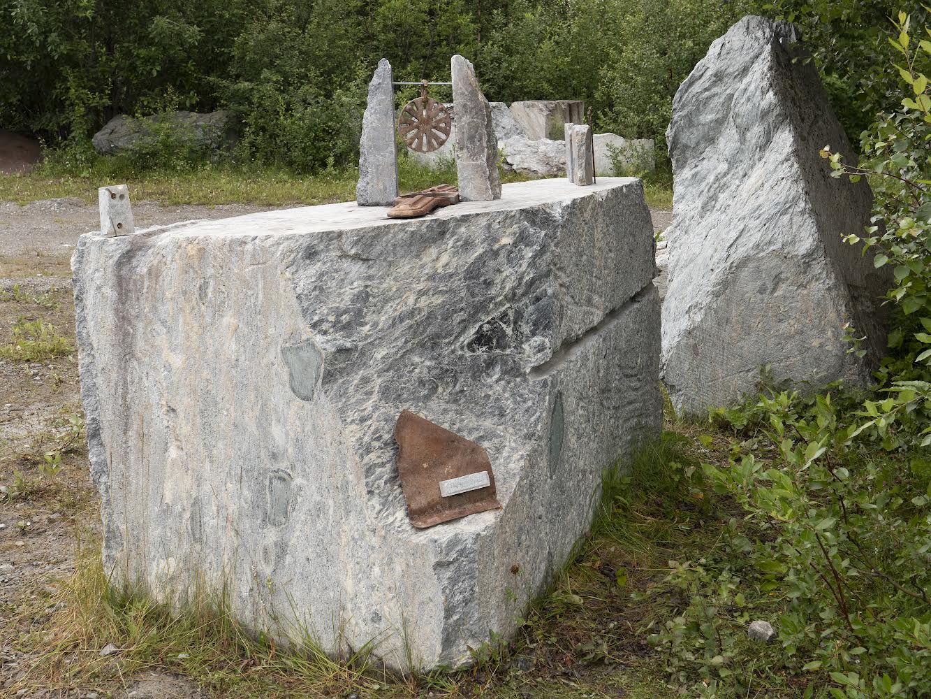 The sculpture “SLITET” was inaugurated on July 23rd, 2023 by Lena Kålen (chairman of Handöl's village association). The name “SLITET” wants to remind of the toil of the workers in the mines and the factory, all the worn material that remains around the factory, and the worn of nature. The sculpture consists of parts that all have a connection to the factory and the site. Things that have been given to Theres K Agdler and things that she found in the vicinity of the boulder